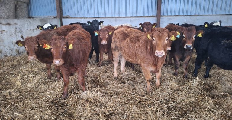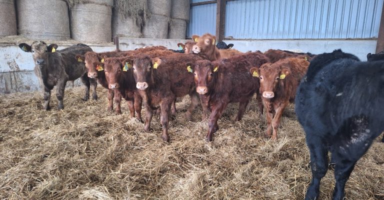 16 Limousin store cattle. Out of mixed beef cows, 10 steers and 6 heifers, 8-11 months old, a bit varied in size but will probably average 280 kgs, just weaned and on silage. Well bred R and U grade cattle